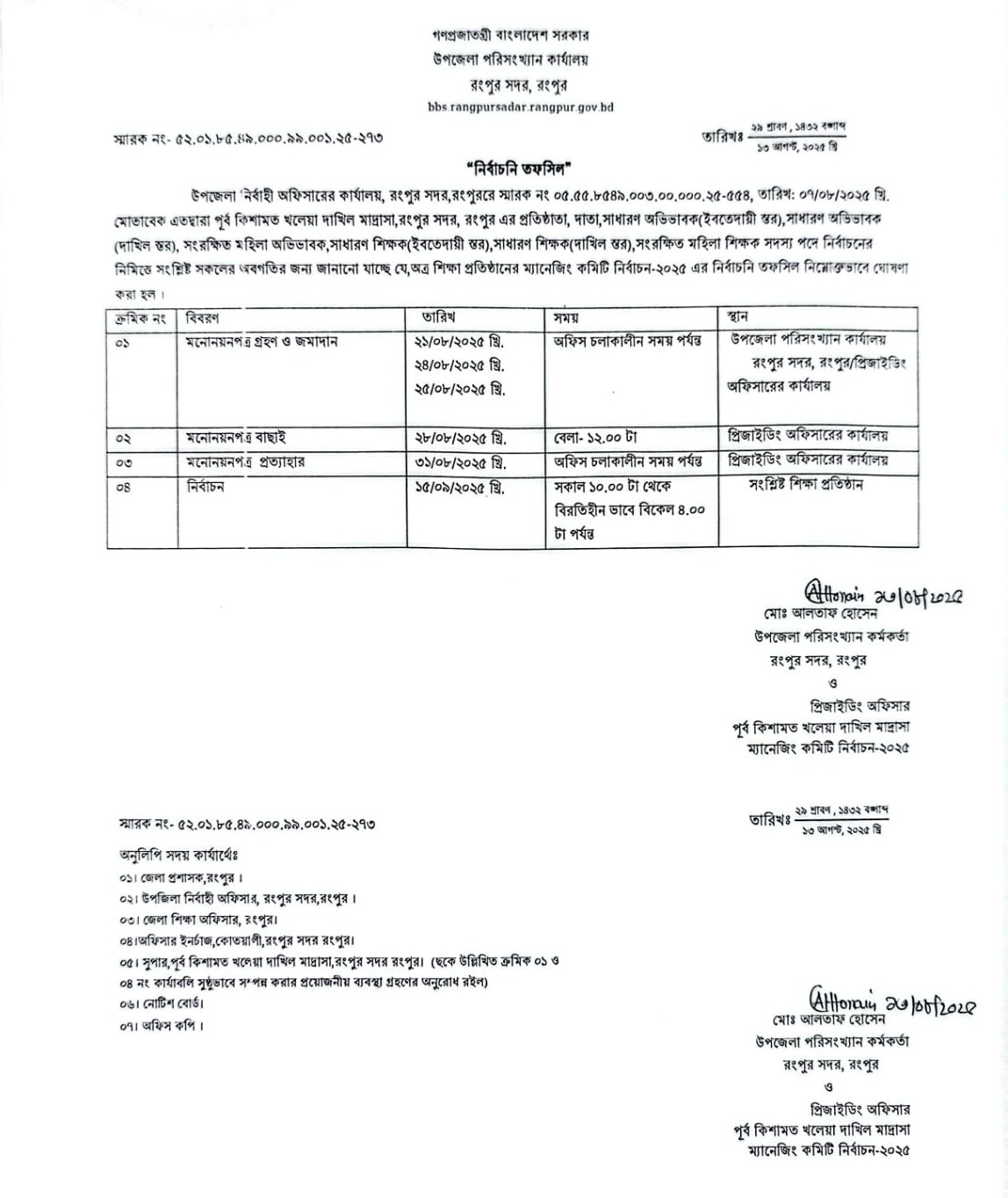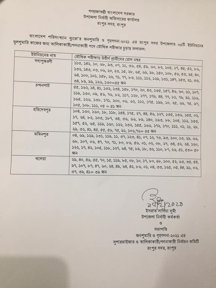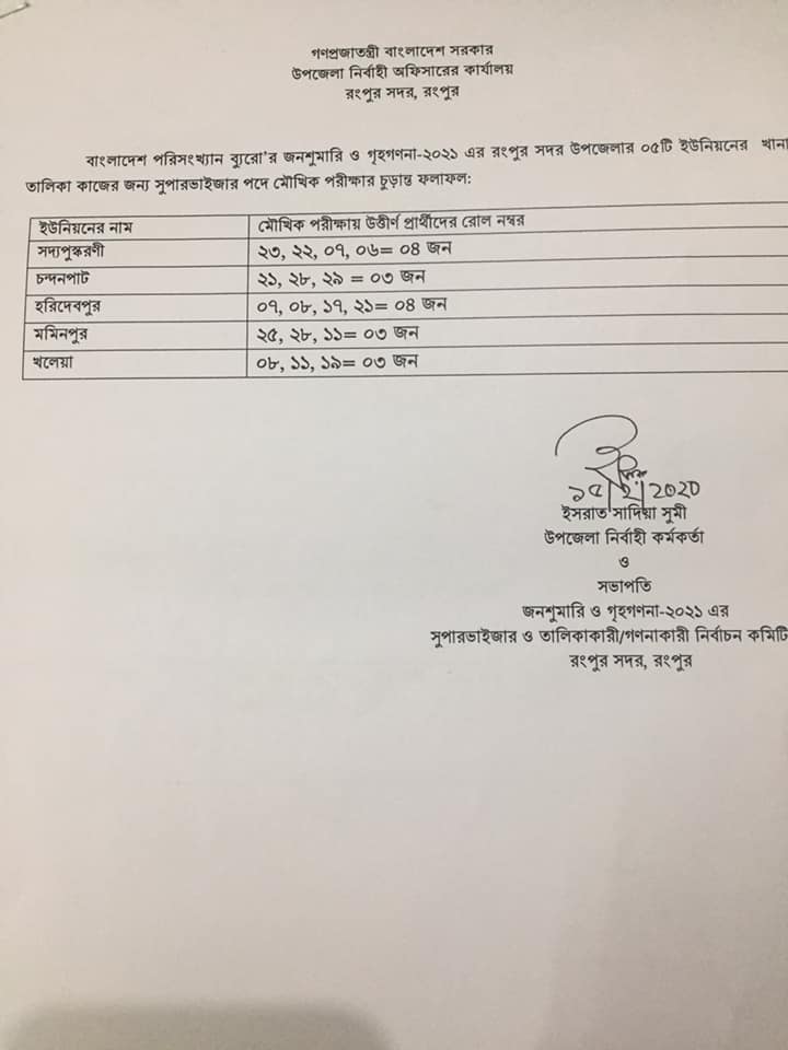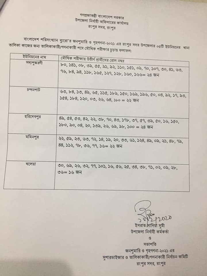রংপুর সদর উপজেলার ০৫ টি ইউনিয়নের জনশুমারি ও গৃহগণনা ২০২১ এর খানা তালিকাকরণ কাজ এবং মুলশুমারি কাজের জন্য তালিকাকারী/গণনাকারী এবং সুপারভাইজার নিয়োগের চুড়ান্ত ফলাফল প্রকাশ